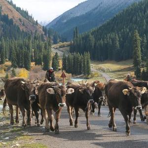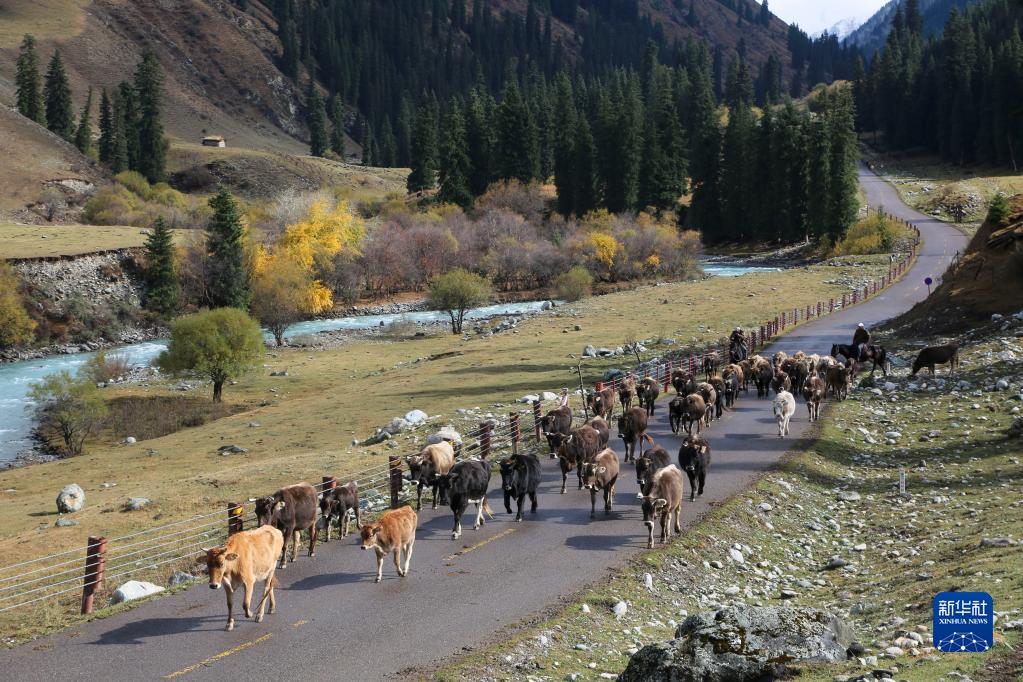 進入10月,新疆伊犁哈薩克自治州昭蘇縣夏特柯爾克孜族鄉闊斯托別村牧民趕著褐牛走出夏塔大峽谷。連日來,隨著氣溫降低,昭蘇縣各族牧民紛紛將山區峽谷里的褐牛趕往平原田野放養。