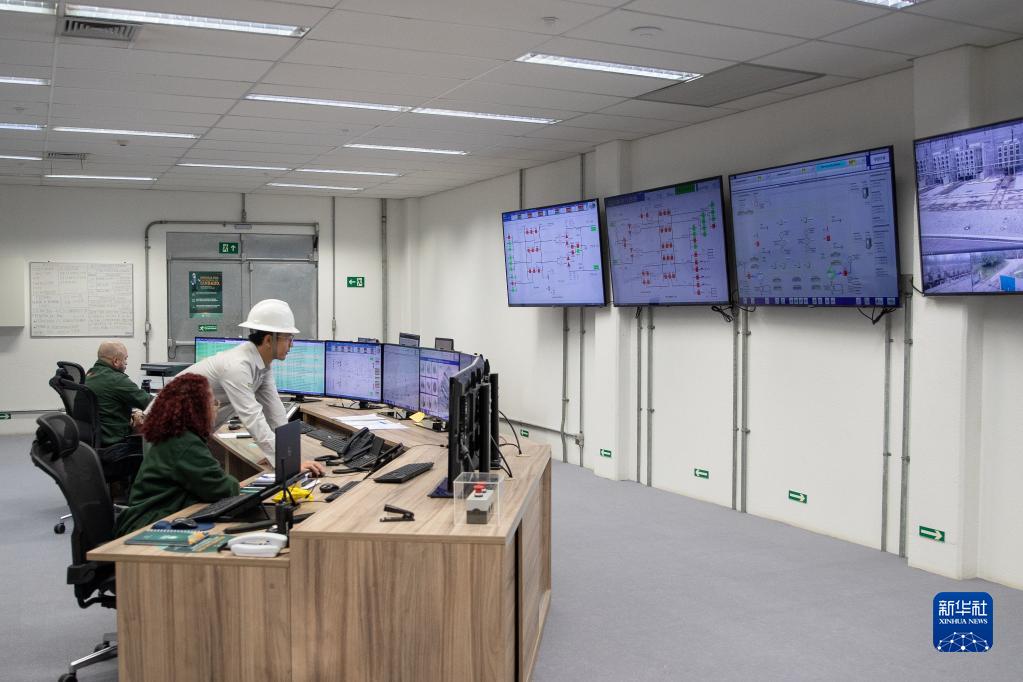 9月30日,在巴西里約熱內盧美麗山特高壓輸電二期項目里約換流站,國網巴控公司換流站運維主管許鴻飛(淺色工裝者)和巴方人員在控制室工作。新華社記者 王天聰 攝
