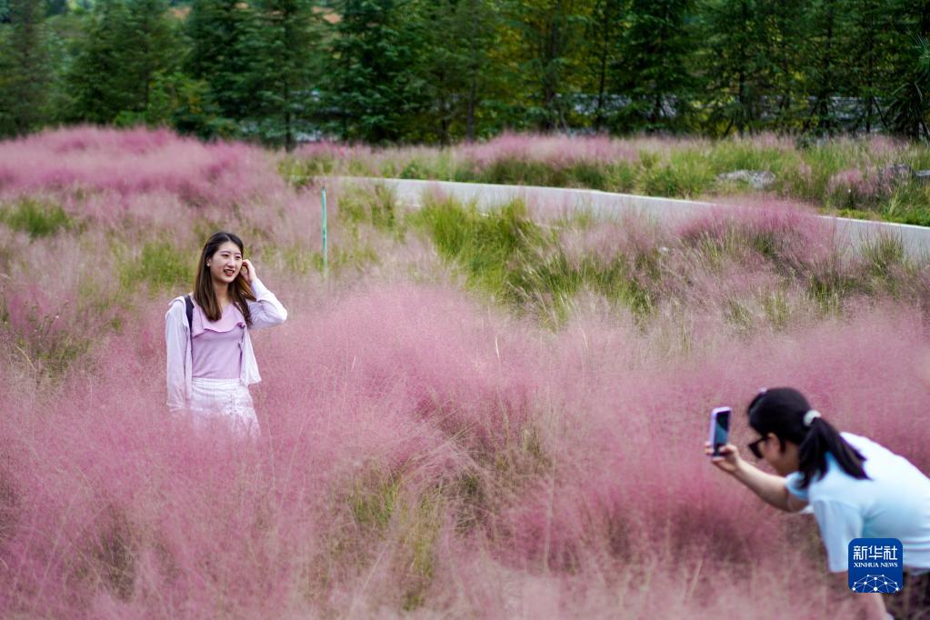 10月2日,游客在疊石花谷景區內粉黛亂子草組成的粉色花海中拍照留念。