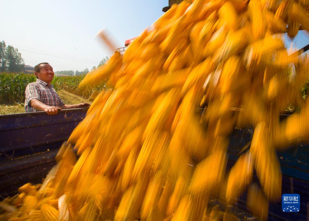 10月3日,在河南省夏邑縣會亭鎮,村民忙著收獲玉米。