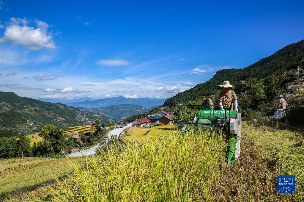 10月3日,在湖北省宜昌市秭歸縣,村民在山間梯田收割水稻。