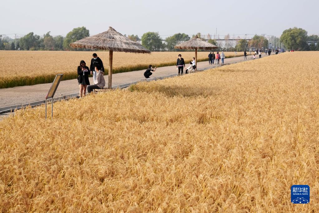 10月2日,人們在北大荒集團閆家崗農場有限公司農業現代化示范區的稻田旁游玩。
