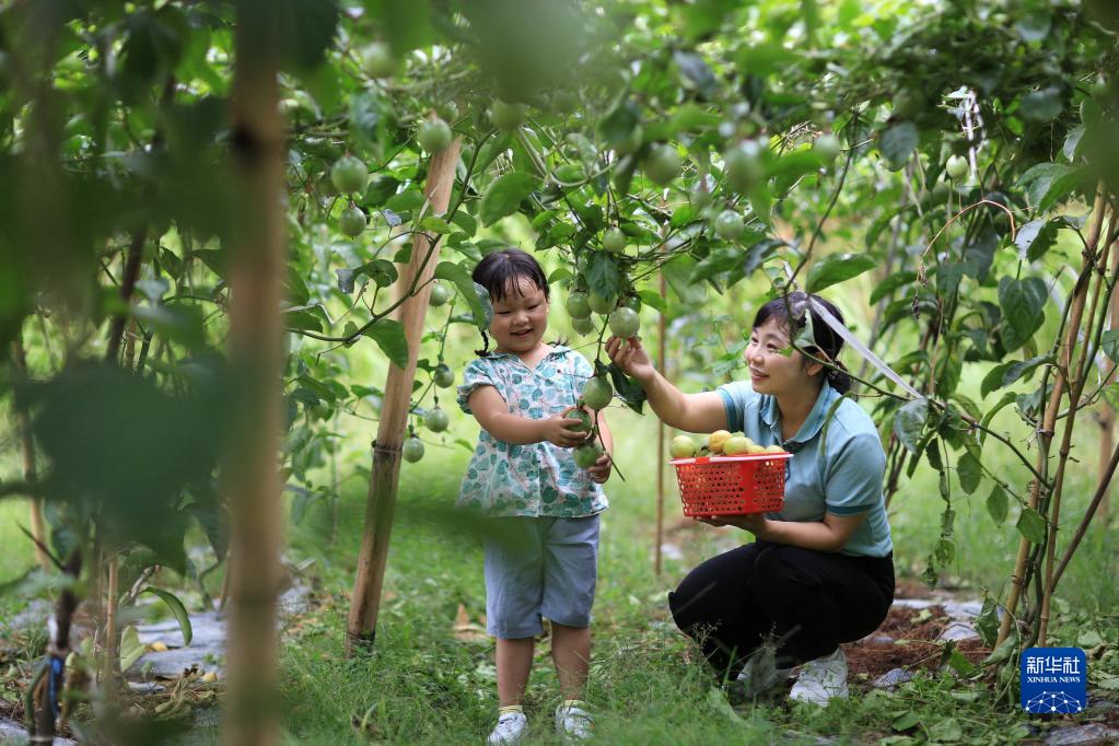 10月2日,游客帶著孩子在貴州省榕江縣平江鎮巴魯村百香果園采摘百香果。