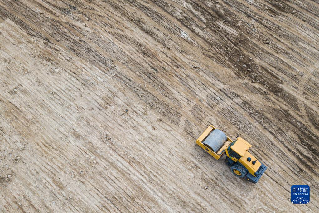 10月3日,工程機械在位于海南洋浦經濟開發區的洋浦海上風電產業園項目工地施工(無人機照片)。