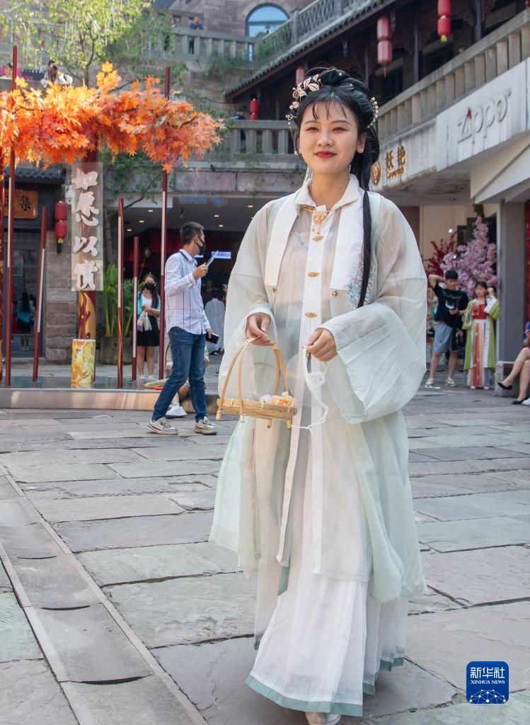10月2日,在千年古鎮磁器口后街,漢服愛好者在景區內游玩。