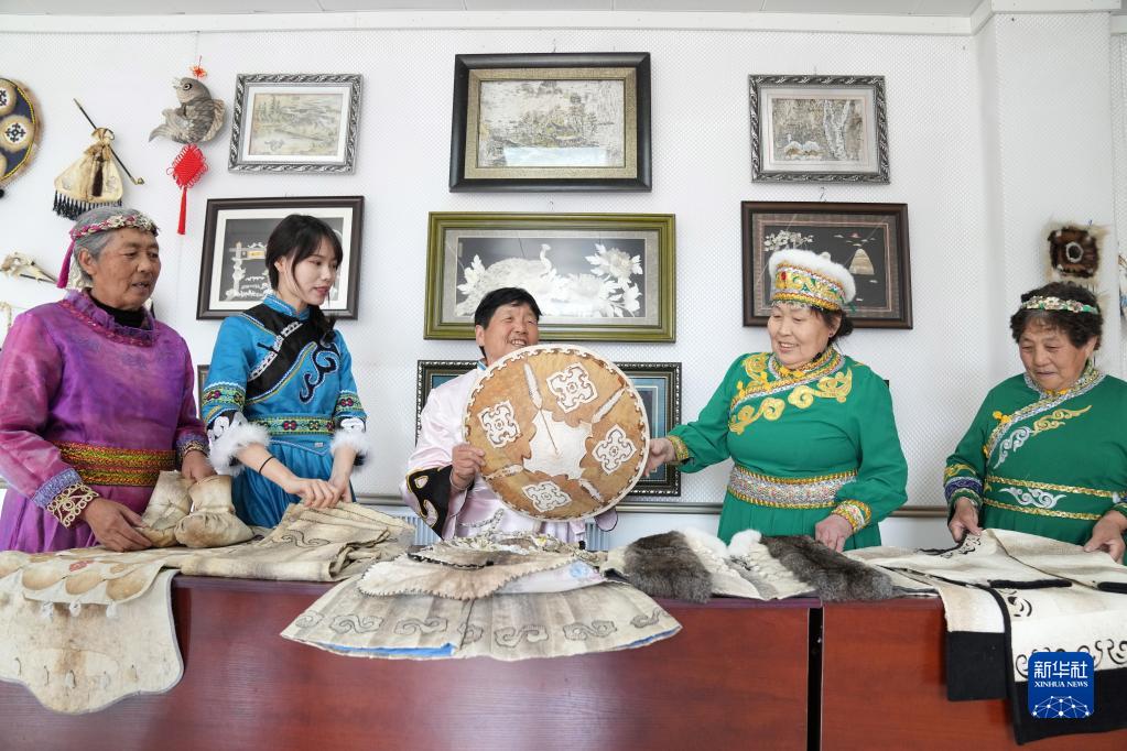 在黑龍江省同江市八岔赫哲族鄉八岔村,村民在交流赫哲族手工藝品制作技藝(2022年5月20日攝)。