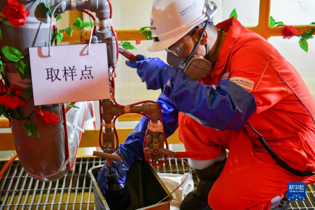 中海油工作人員在“?;惶枴比狱c接取原油(9月30日攝)。
