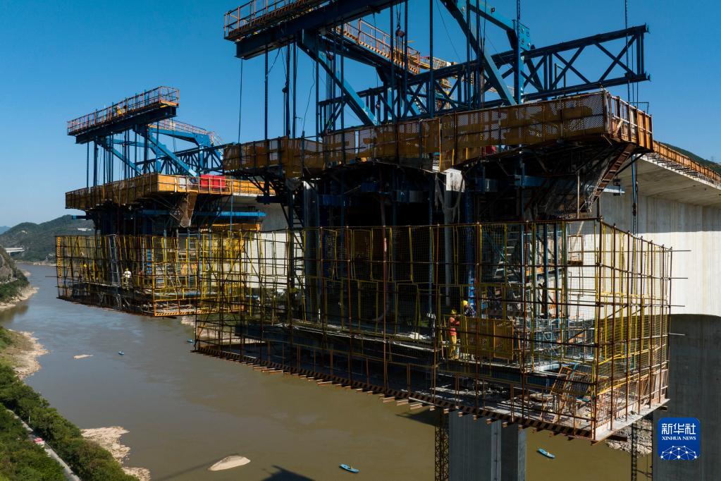 10月3日,中交一公局的工人在重慶市北碚區渝武高速公路復線觀音峽嘉陵江特大橋項目現場施工作業(無人機照片)。