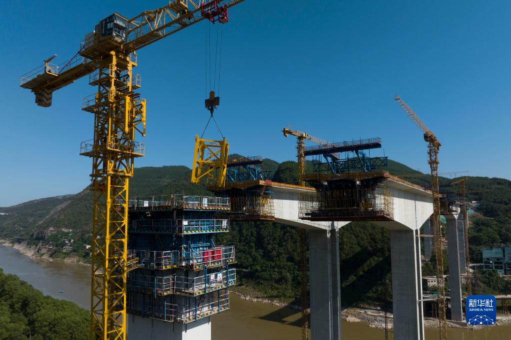 這是10月3日拍攝的重慶市北碚區渝武高速公路復線觀音峽嘉陵江特大橋項目施工現場(無人機照片)。