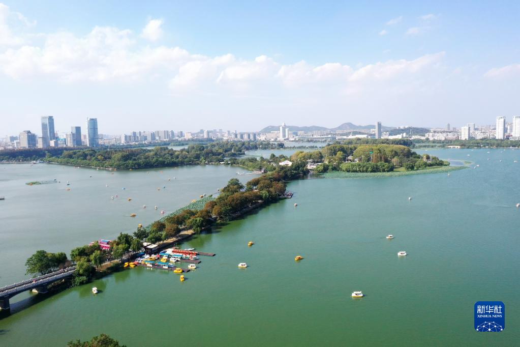 10月3日,游客在南京玄武湖公園劃船游玩(無人機照片)。