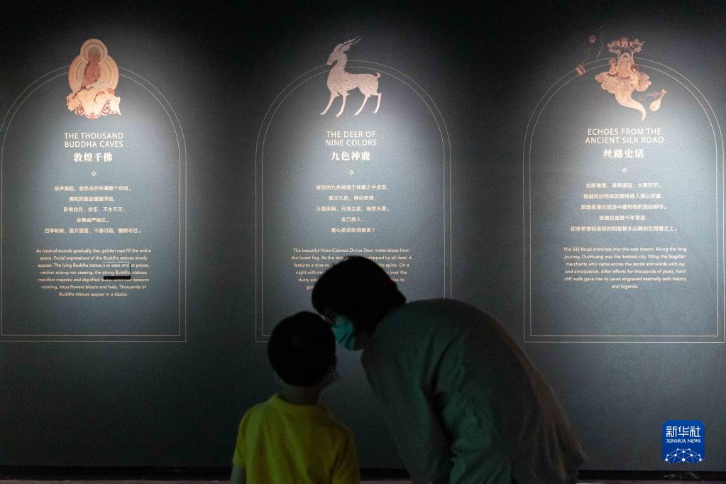 “遇見敦煌 光影藝術展”將于10月4日在遇見博物館·上海靜安館開展。3日,部分媒體及觀眾提前參觀體驗。該展以敦煌文化藝術為核心,以藝術家重繪的200余幅敦煌石窟壁畫作品為基礎,通過3D光雕技術和數十臺4K超清設備,在投影面積達1300平方米的空間中展現敦煌石窟的藝術魅力,為觀眾帶來沉浸式體驗。新華社記者 王翔 攝
