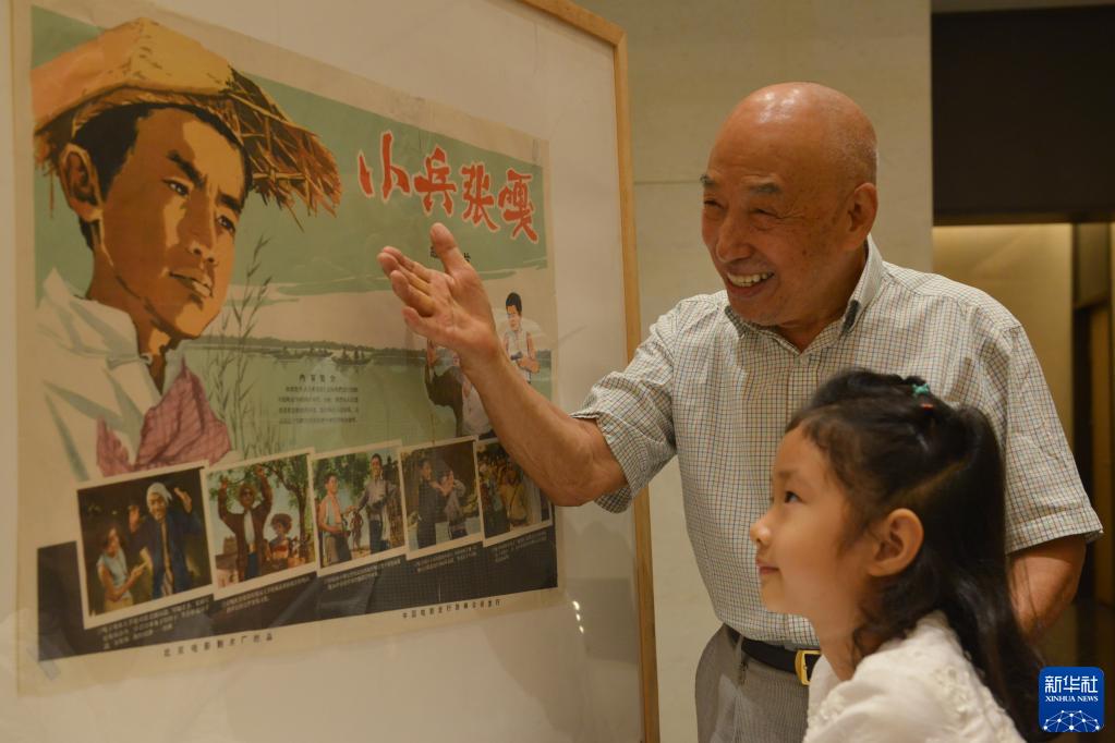 10月3日,82歲的張子誠在河北省石家莊市新華區為孩子講述紅色電影海報背后的故事。張子誠多年來共收藏電影海報六千多張,多次舉辦主題展覽。