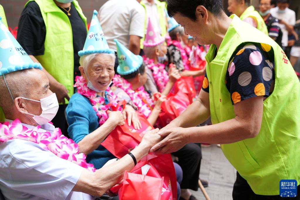 在南昌市東湖區火神廟社區,“時間銀行”志愿者陪著社區的老人一起過生日(9月29日攝)。