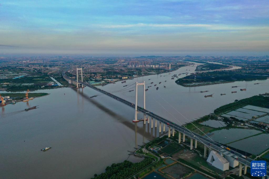 南沙大橋全景(2022年6月29日攝,無人機照片)。南沙大橋上跨珠江口獅子洋水域,連接廣州市南沙區東涌鎮、番禺區海鷗島和東莞市沙田鎮。