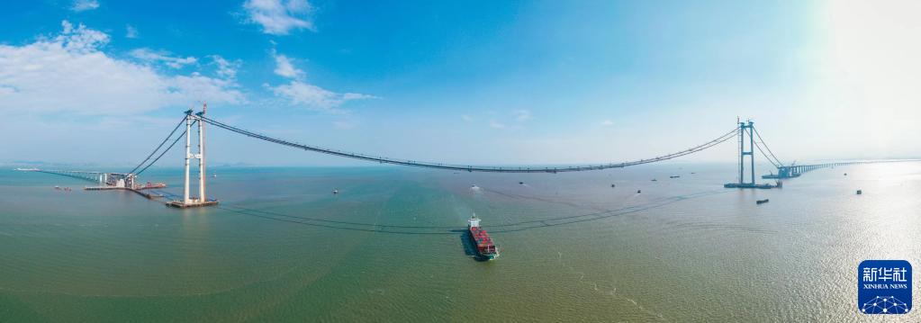 正在建設的珠江入??谏钪型ǖ懒尕暄蟠髽蛑骼|完成架設(2022年9月23日攝,無人機照片)。