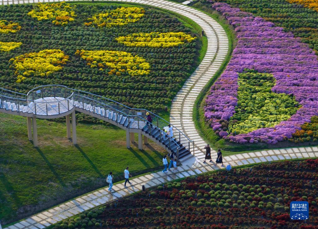 10月3日,游客在江蘇省淮安市白馬湖旅游度假區中的菊花展上賞花(無人機照片)。
