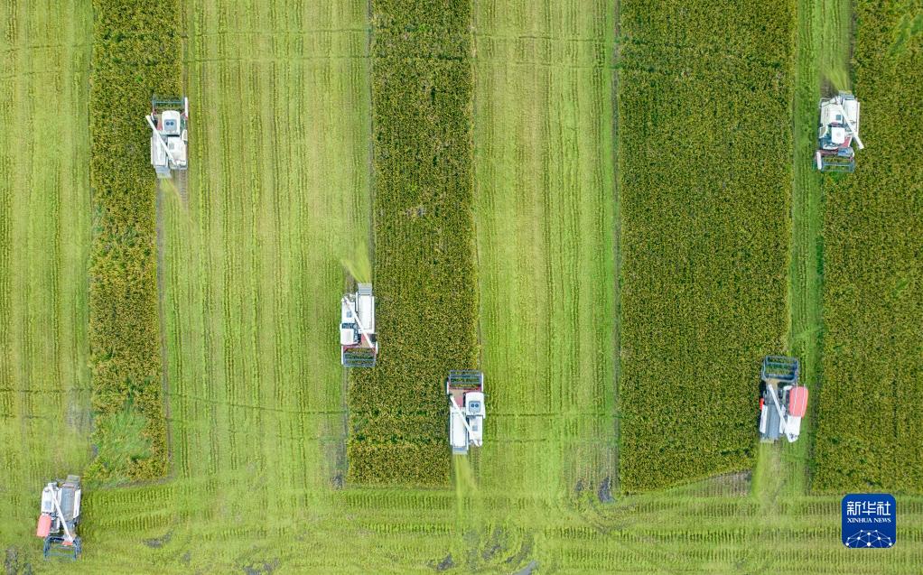 10月3日,在江蘇省海安市,農民在駕駛機械收割水稻(無人機照片)。