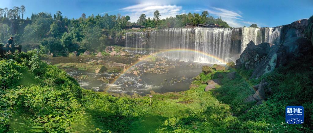 這是10月3日拍攝的四川廣安萬春橋瀑布(無人機照片)。