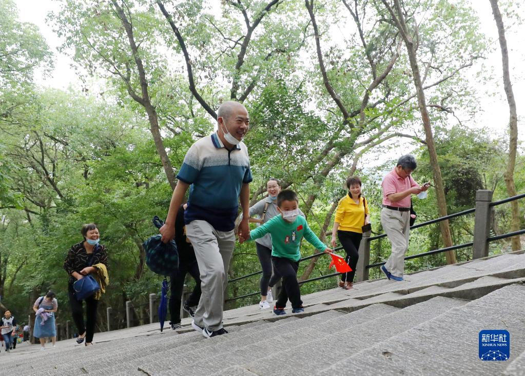 10月4日,老人牽著孩子在上海佘山國家森林公園登山。