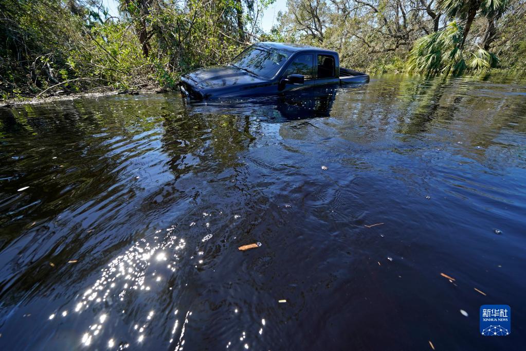 這是10月3日在美國佛羅里達州北港拍攝的淹在洪水中的車輛。