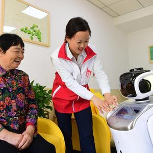 9月30日,在肥西縣上派鎮“愛和家”居家養老服務中心,工作人員為老人介紹智能機器人的使用方法。