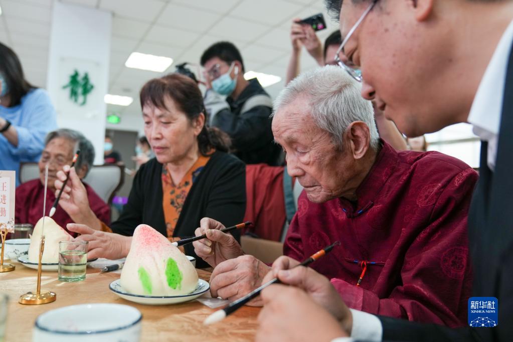 10月4日,南京大屠殺幸存者王義隆老人(右二)在描壽桃。