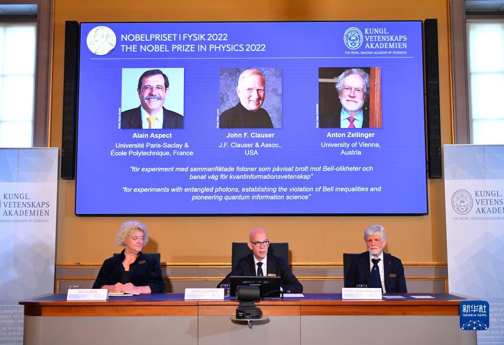 瑞典皇家科學院4日宣布,將2022年諾貝爾物理學獎授予法國科學家阿蘭·阿斯佩、美國科學家約翰·克勞澤和奧地利科學家安東·蔡林格,以表彰他們在“糾纏光子實驗、驗證違反貝爾不等式和開創量子信息科學”方面所做出的貢獻。