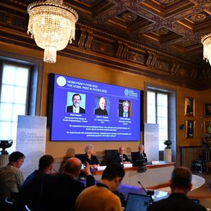10月4日,在瑞典斯德哥爾摩舉行的2022年諾貝爾物理學獎公布現場,屏幕上顯示獎項得主阿蘭·阿斯佩(左)、約翰·克勞澤(中)和安東·蔡林格的照片。