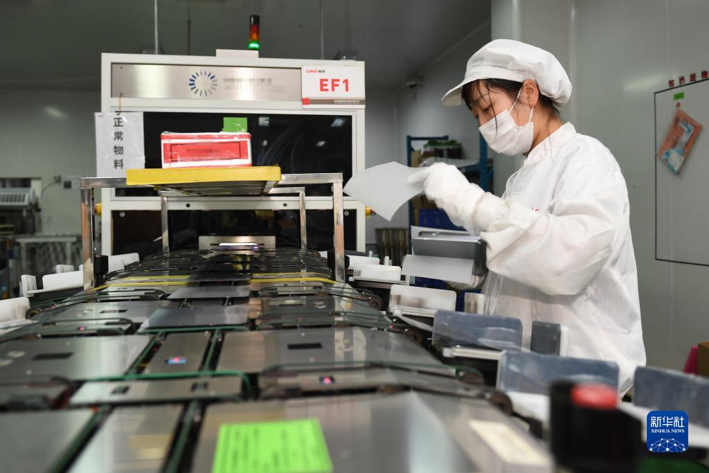 在隆基綠能科技股份有限公司西安切片工廠,工人在進行檢測包裝作業(2022年1月18日攝)。新華社記者 李一博 攝