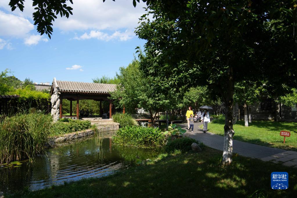 2022年8月16日,人們在北京市東城區三里河參觀游覽。曾經雜院林立的草廠三里河,如今小橋、流水、廊亭、人家,頗有水鄉意境。 新華社記者 鞠煥宗 攝