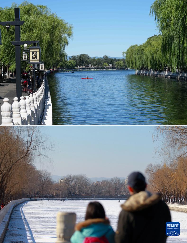 這是一張拼版照片:上圖為2022年8月31日,在銀錠橋上觀看的“銀錠觀山”風景。北京積水潭醫院新北樓拆除后,曾經被高樓遮擋的美景,重新映入人們眼簾(新華社記者鞠煥宗攝);下圖為2013年2月4日拍攝的游人在后海銀錠橋觀賞“燕京小八景”之一的“銀錠觀山”(資料照片,史春陽攝)。 新華社發