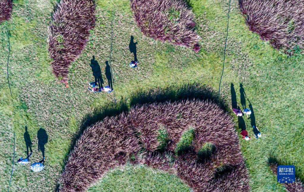 10月5日,市民在云南昆明寶豐半島濕地公園游覽(無人機照片)。