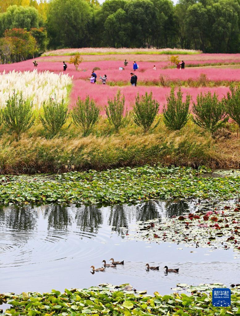 10月5日,在山東省滕州市一濕地景區,水中的鴨子與遠處的游客相映成景。