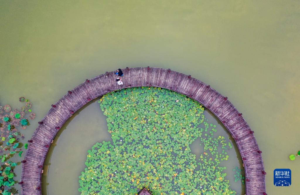 10月5日,游客在貴州省銅仁市玉屏侗族自治縣茶花泉景區游覽(無人機照片)。