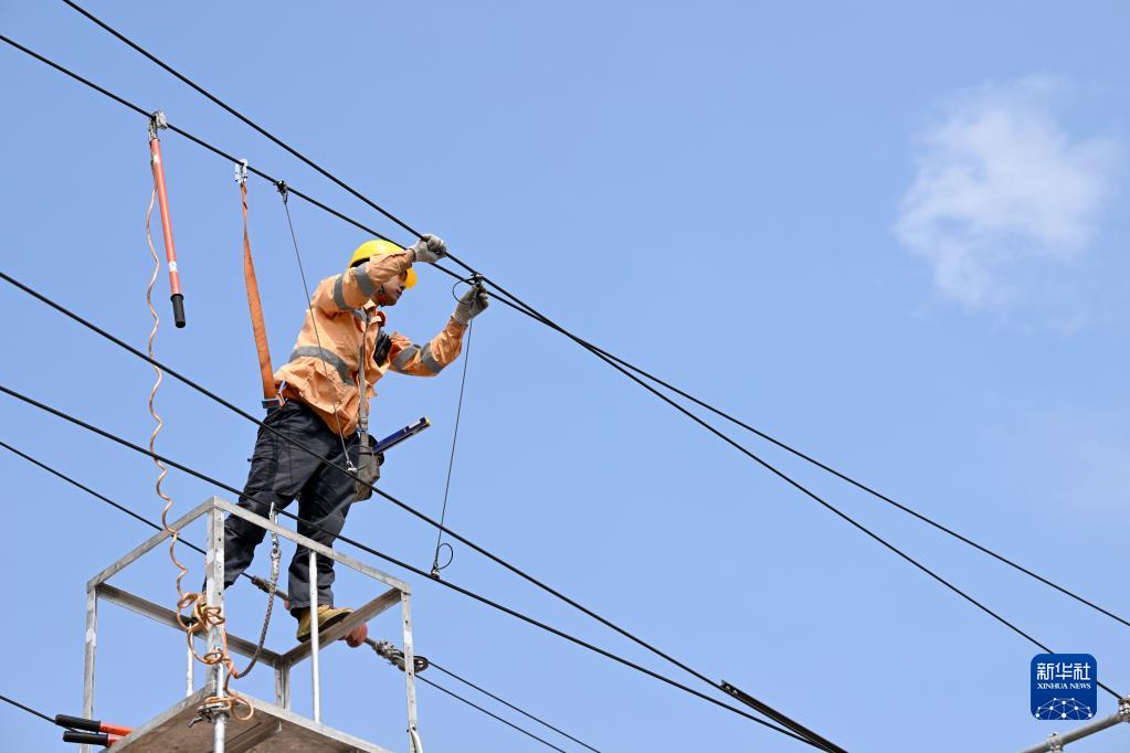10月4日,在位于安徽黃山的杭昌高速鐵路黃山北存車場,接觸網工在檢修接觸網設備。