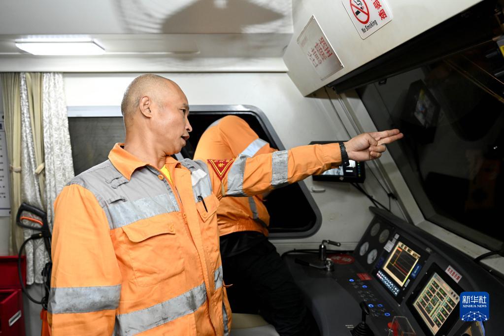 10月4日晚,在安徽宣城,中國鐵路上海局集團有限公司南京供電段績溪北接觸網工區接觸網檢修作業車司機在確認出站信號。