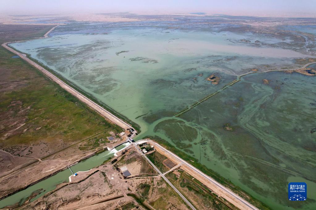 這是2022年8月20日拍攝的新疆尉犁縣境內大西海子水庫以及泄洪閘(無人機照片)。