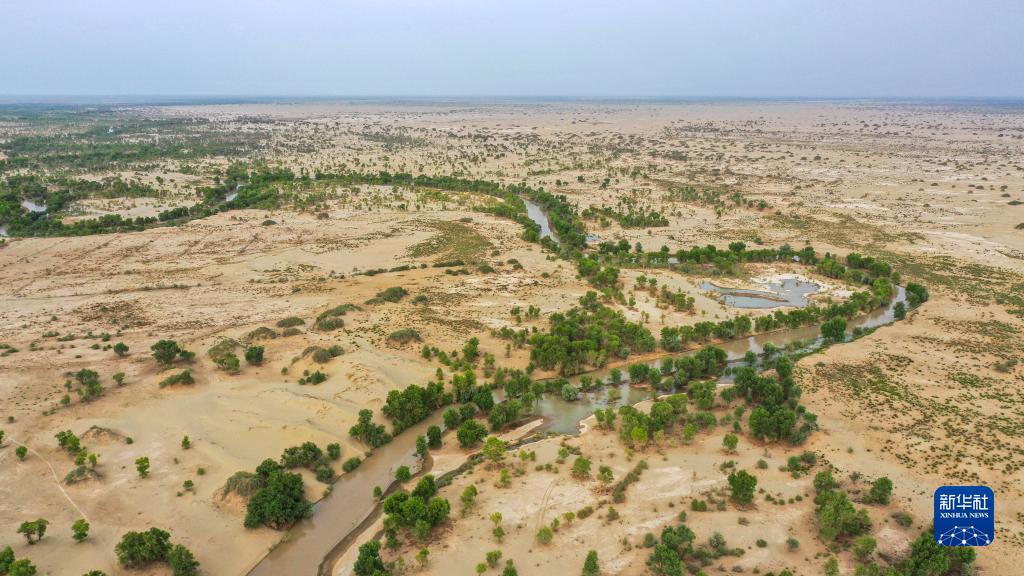 這是2022年6月20日拍攝的新疆尉犁縣墩闊坦鄉托布協區域,生態輸水滋養了植被(無人機照片)。