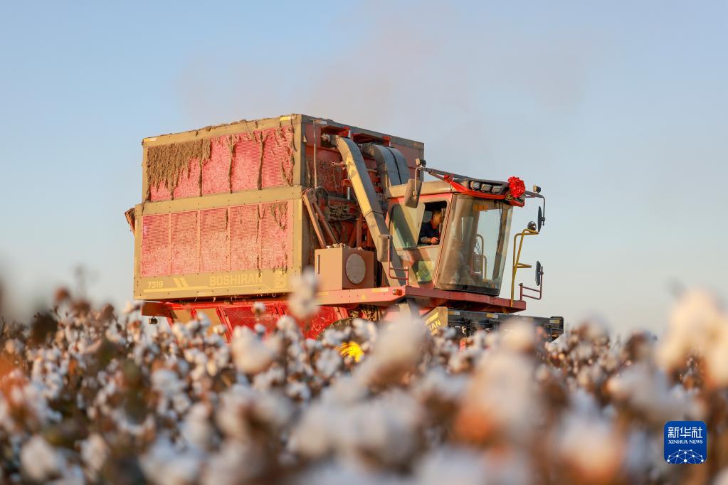 2022年9月26日,新疆阿克蘇地區沙雅縣塔里木鄉其格格熱木村村民黃清順開著新買的采棉機采收棉花。