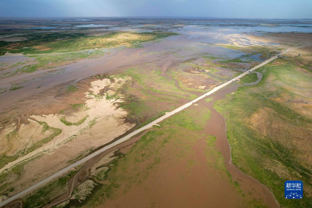 這是2022年8月19日拍攝的車爾臣河水流入臺特瑪湖(無人機照片)。
