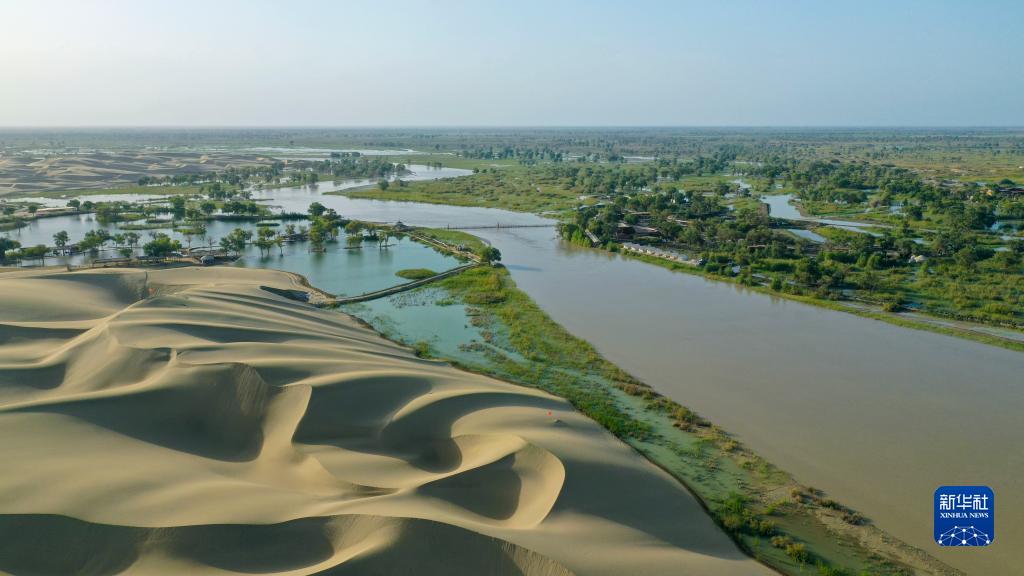 這是2022年8月20日在新疆尉犁縣羅布人村寨景區拍攝的塔里木河沿岸景色(無人機照片)。