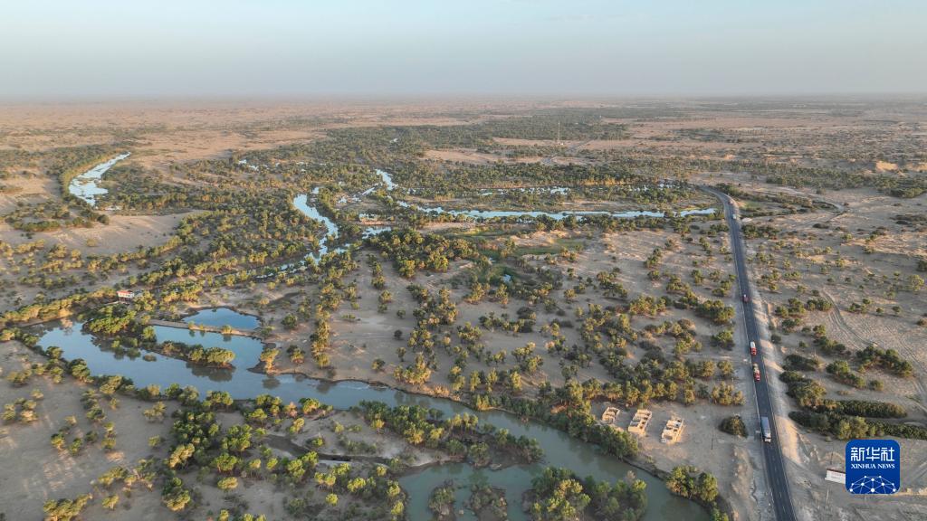 這是2022年8月18日拍攝的塔里木河下游阿拉干斷面景象(無人機照片)。生態水滋潤兩岸胡楊等植被,同時保障交通要道少受風沙侵襲。