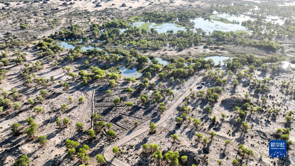 這是2022年8月18日拍攝的塔里木河下游昆阿斯特區域景象(無人機照片)。生態輸水后,這里的植被生長良好。