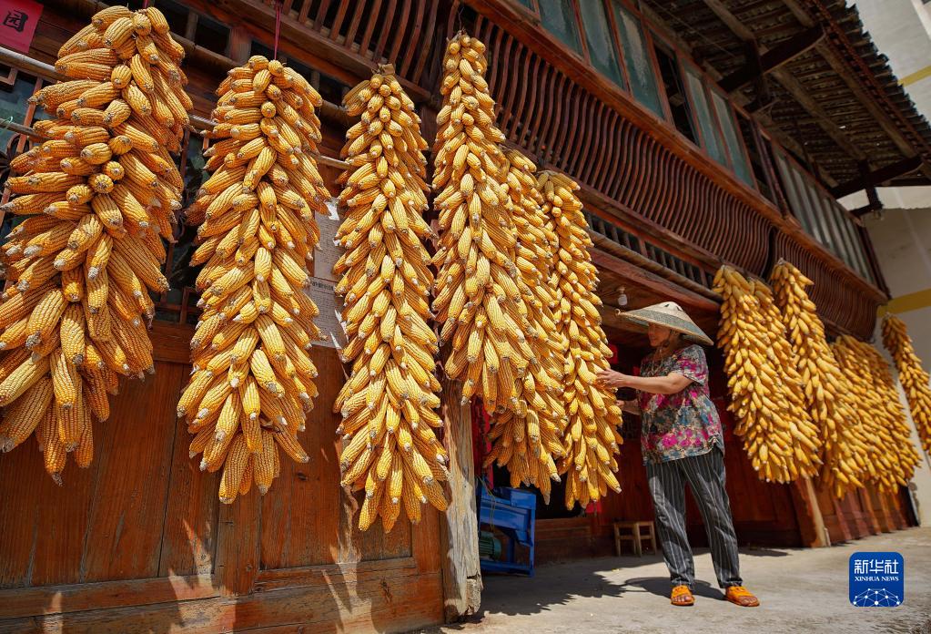 10月5日,貴州省黔東南苗族侗族自治州丹寨縣興仁鎮中營村村民在晾曬玉米。