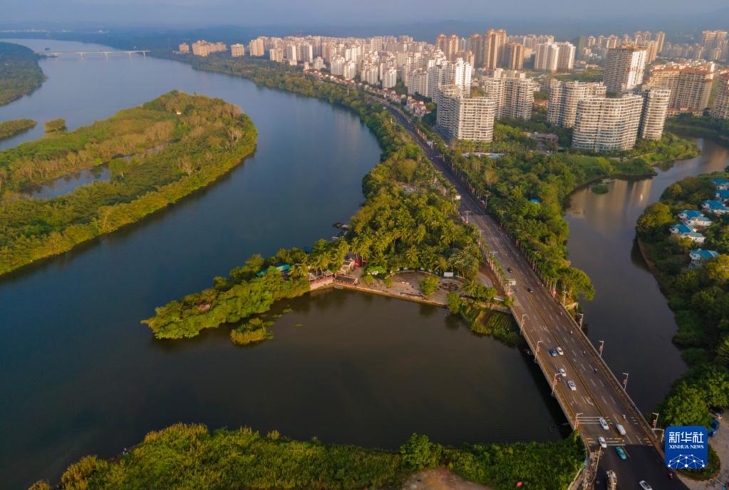 車輛行駛在海南省瓊海市嘉積鎮萬泉河畔新城區沿河路上(2022年3月25日攝,無人機照片)。