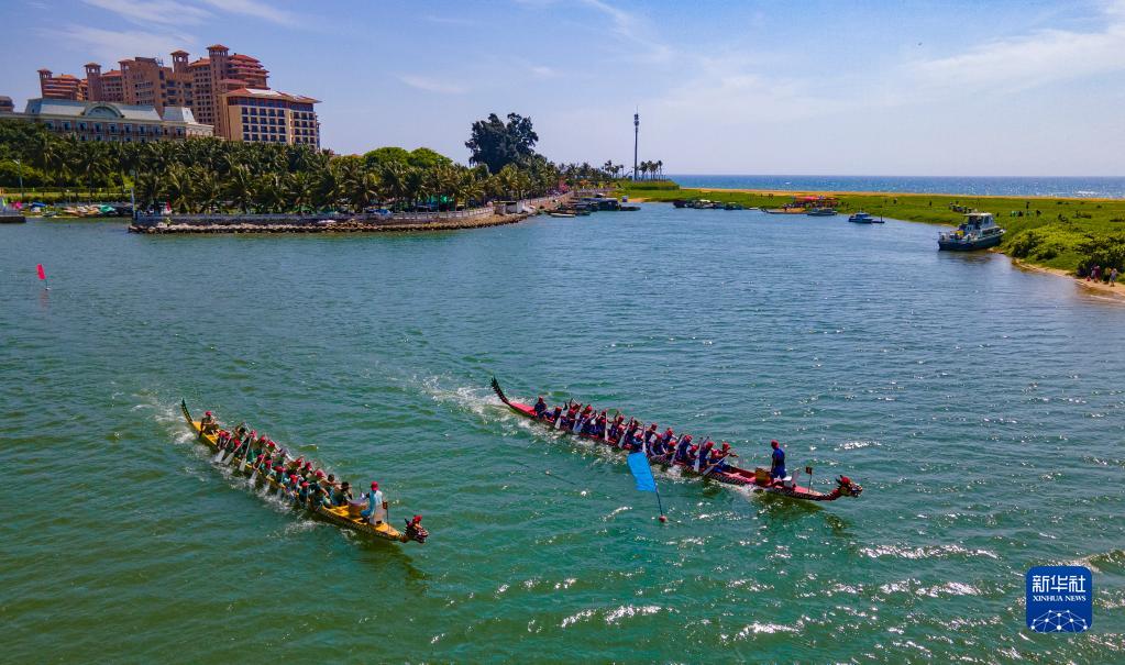 海南省瓊海市博鰲鎮在萬泉河入??谂e行龍舟賽活動(2022年6月3日攝,無人機照片)