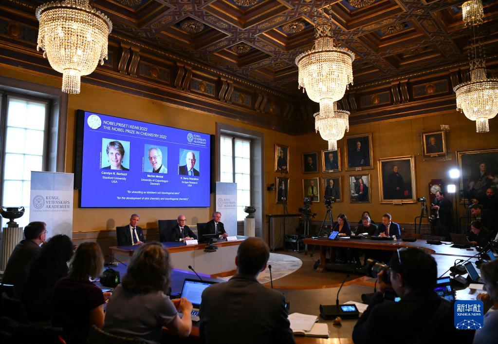 瑞典皇家科學院5日宣布,將2022年諾貝爾化學獎授予美國科學家卡羅琳·貝爾托齊、卡爾·巴里·沙普利斯和丹麥科學家莫滕·梅爾達爾,以表彰他們在發展點擊化學和生物正交化學方面的貢獻。