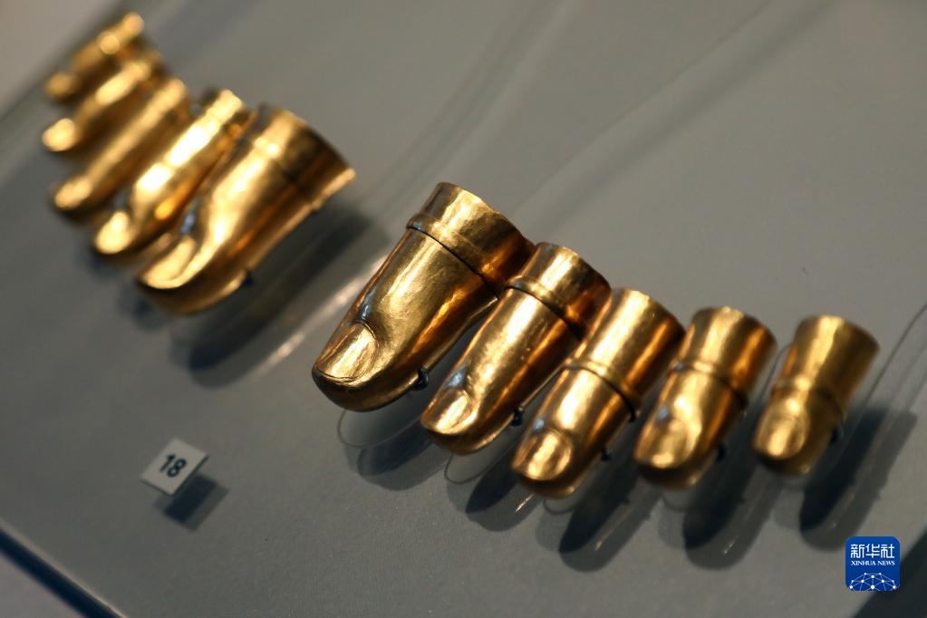 這是10月3日在位于埃及開羅的埃及博物館拍攝的金質腳趾套。 新華社發(艾哈邁德·戈馬攝)