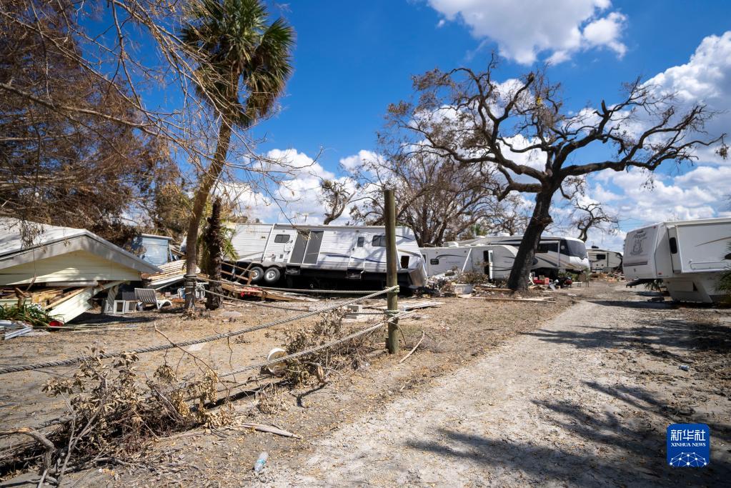 這是10月4日在美國佛羅里達州邁爾斯堡拍攝的遭颶風“伊恩”破壞的房車營地。 新華社發(羅蘭多·洛佩斯攝)