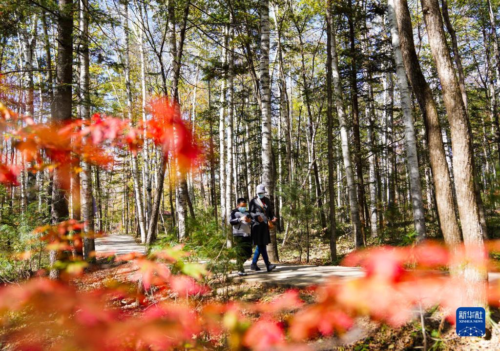 10月5日,游人在吉林紅石國家森林公園內游覽。